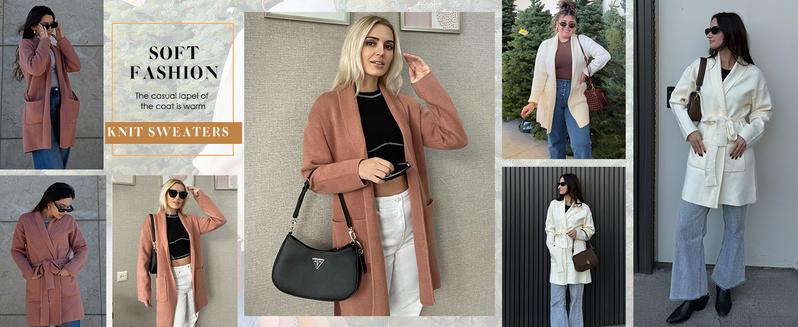 Open front women cardigan sweater with a belt, long sleeves, lapel collar, and two convenient pockets. Knee-length, solid color, oversized knit sweater coats. Trendy coatigan for women, slouchy and boyfriend style. Loose fit but not too bulky, allowing free movement. Perfect for casual elegance. This cardigan is a stylish choice for everyday wear.